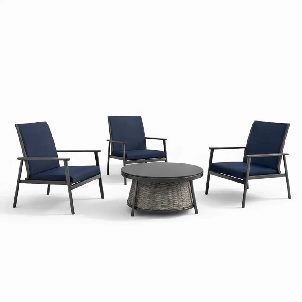 Set da conversazione da giardino in alluminio e poliestere blu con tavolino rotondo in rattan